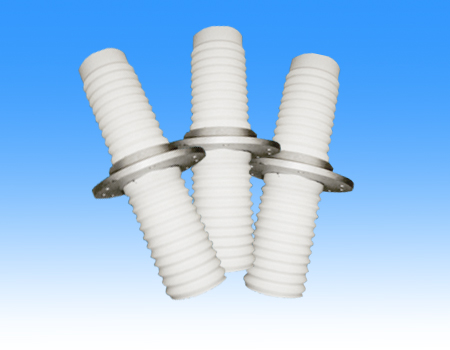 穿墻套管,用于靜電除塵器電暈極母線穿過靜電除塵器殼體的支撐和絕緣。穿墻套管絕緣子按結果分為組合式和純瓷式。適用與工作溫度不超過250℃,直流工作電壓不超過72KV~100KV,安裝地點海拔小于1000米的工作環境。組合式穿墻套管由瓷件和金屬附件用耐高溫膠合劑膠裝而成,瓷件表面是白色釉或者棕色釉,金屬表面涂防銹漆。